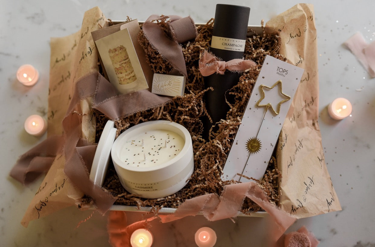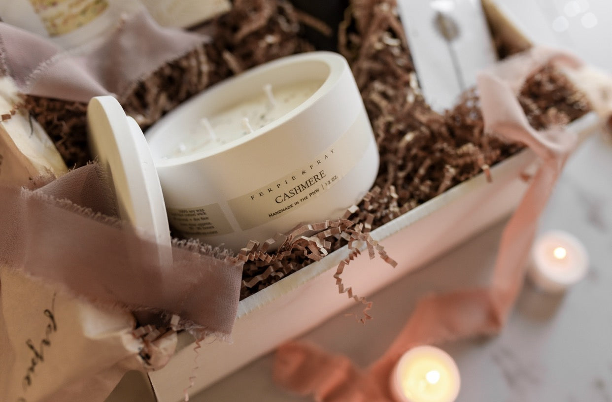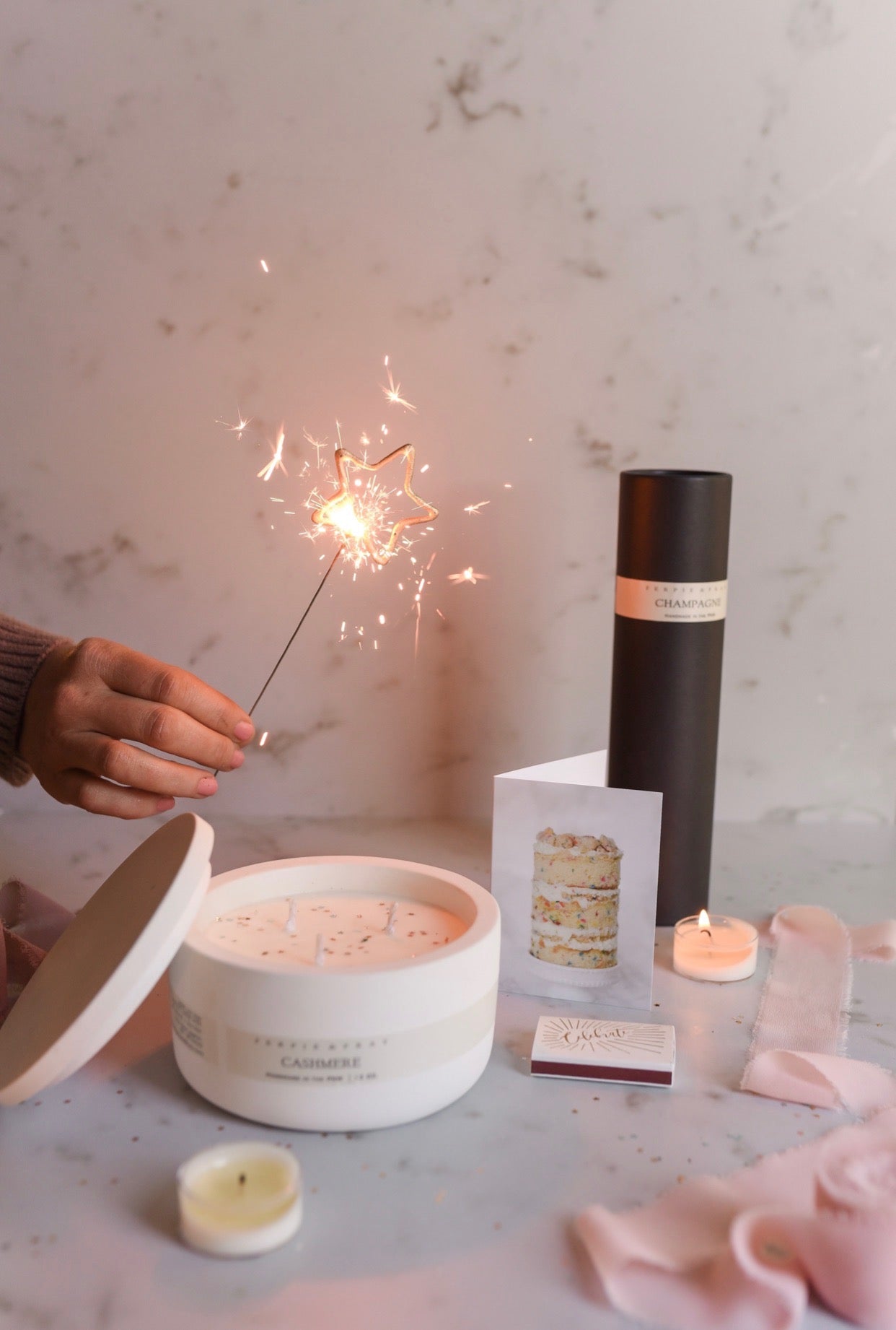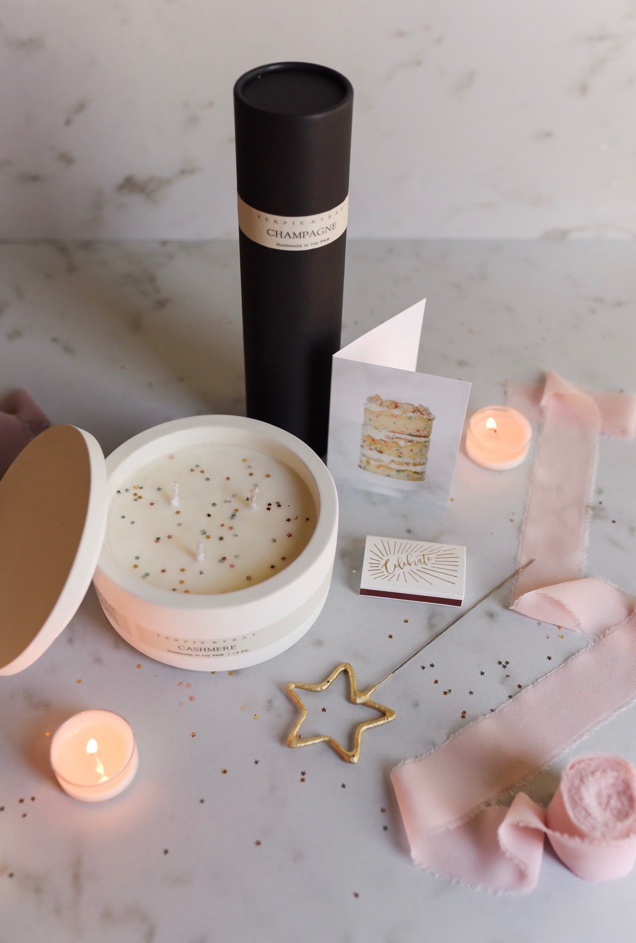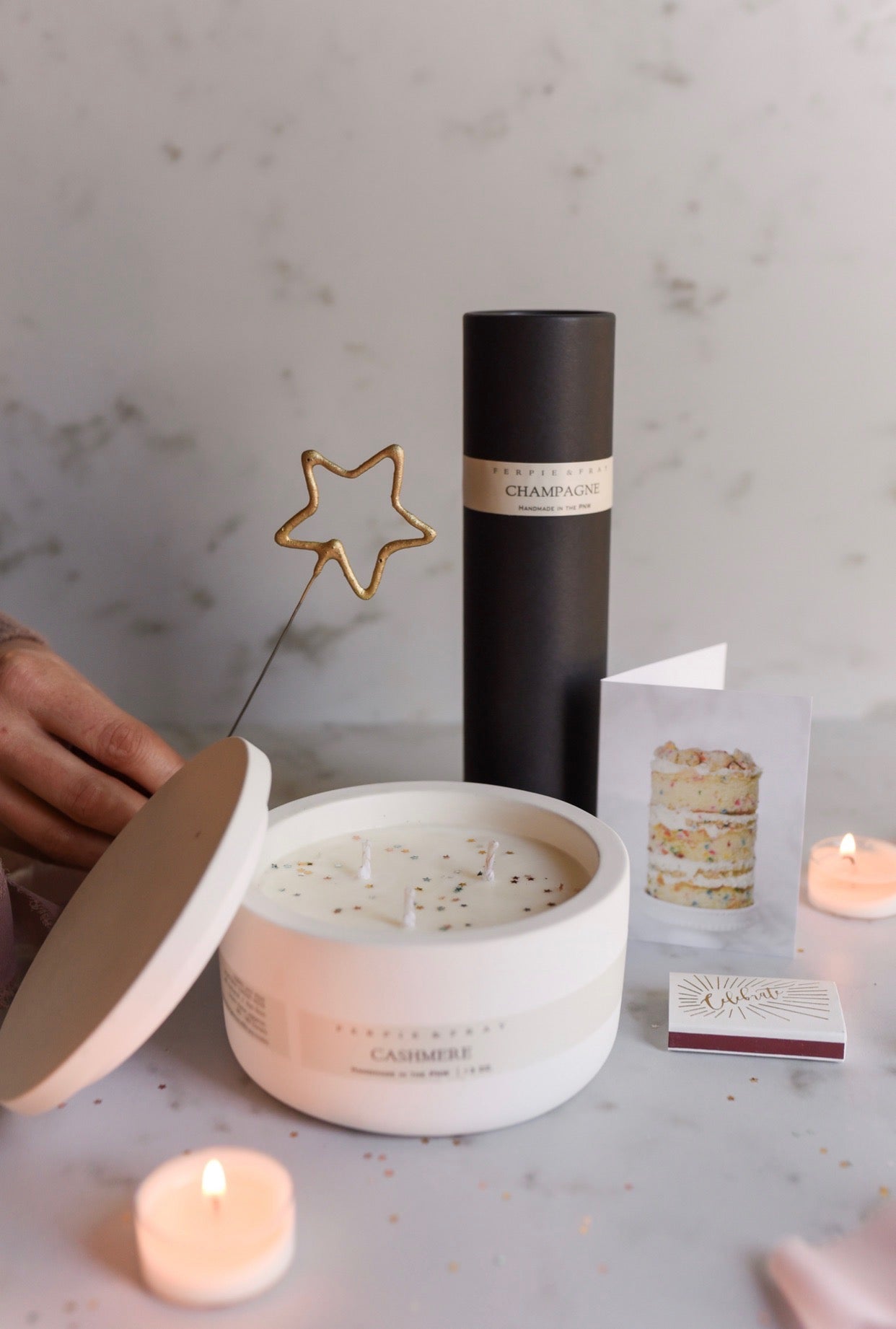 -Flower Pot Candles (topped with glitter!) in "Cashmere" // a blend with a cozy warmth with notes of almond, shea and coconut. Plum and Black Cherry shine through the base of this scent and gives a perfect balance of both soft + inviting and WILDLY entertaining!