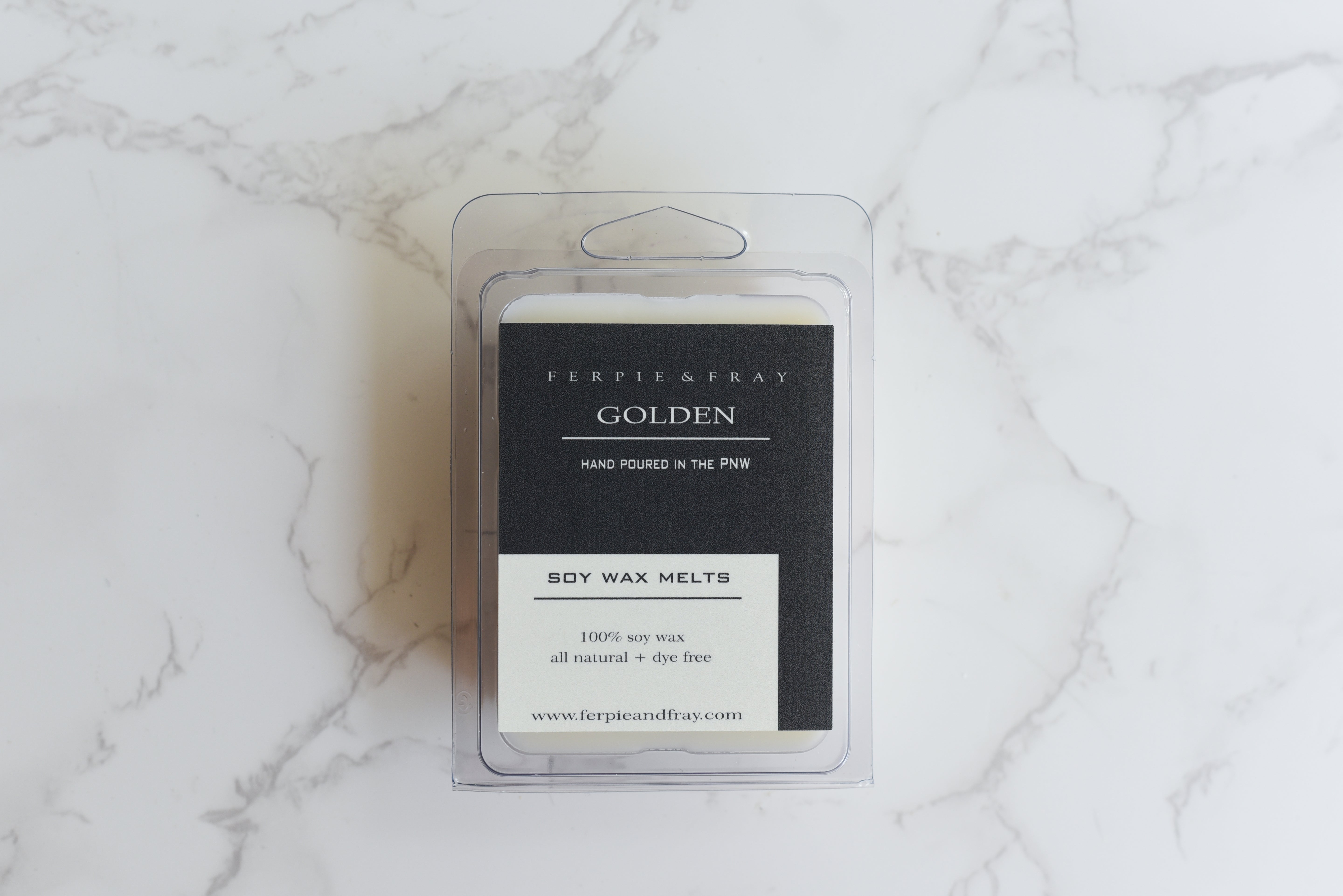Golden: This scent is a personal favorite! It has perfect soft tropical notes of orange + pineapple with a softness of shea and almond. It is like a vacation in your home.