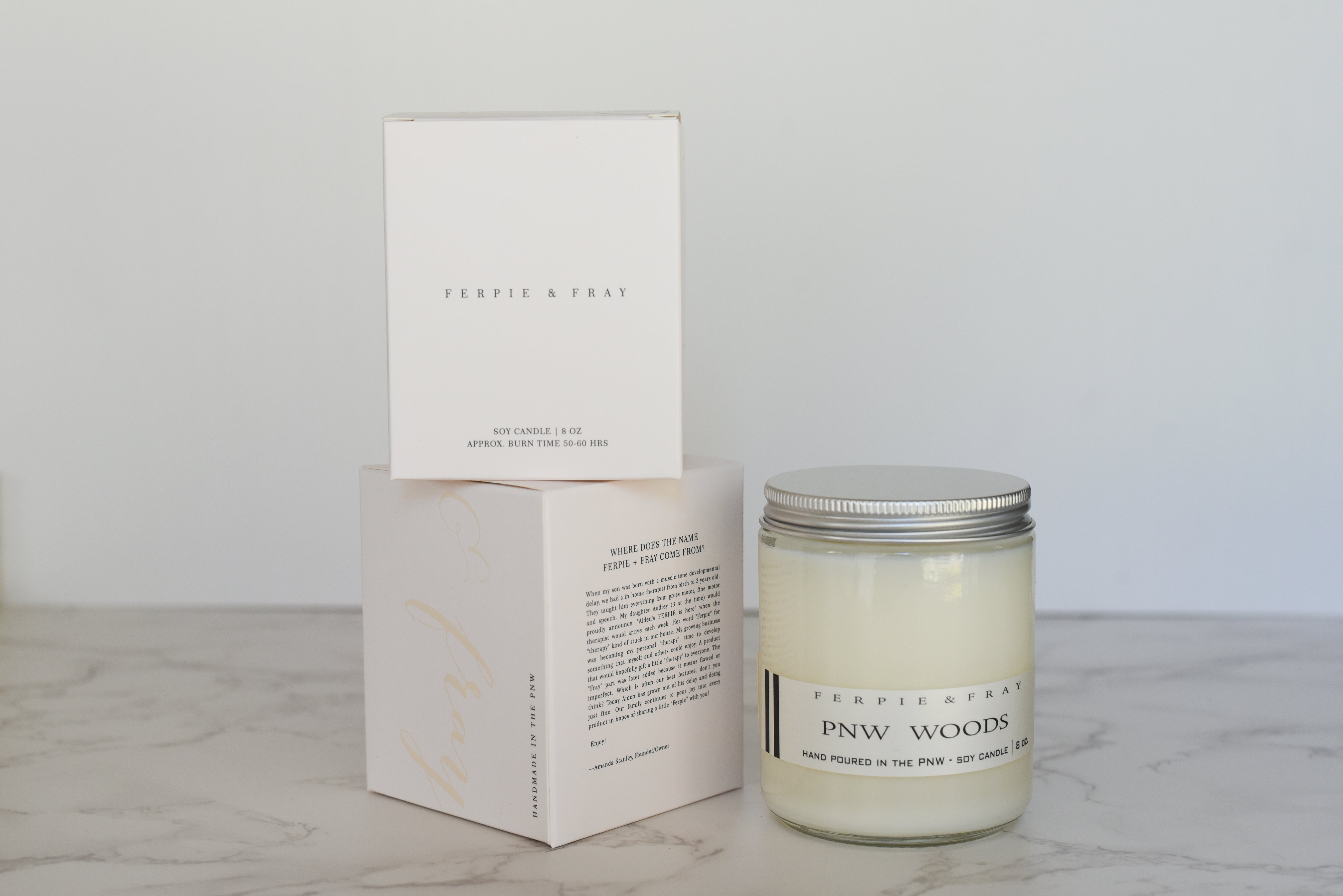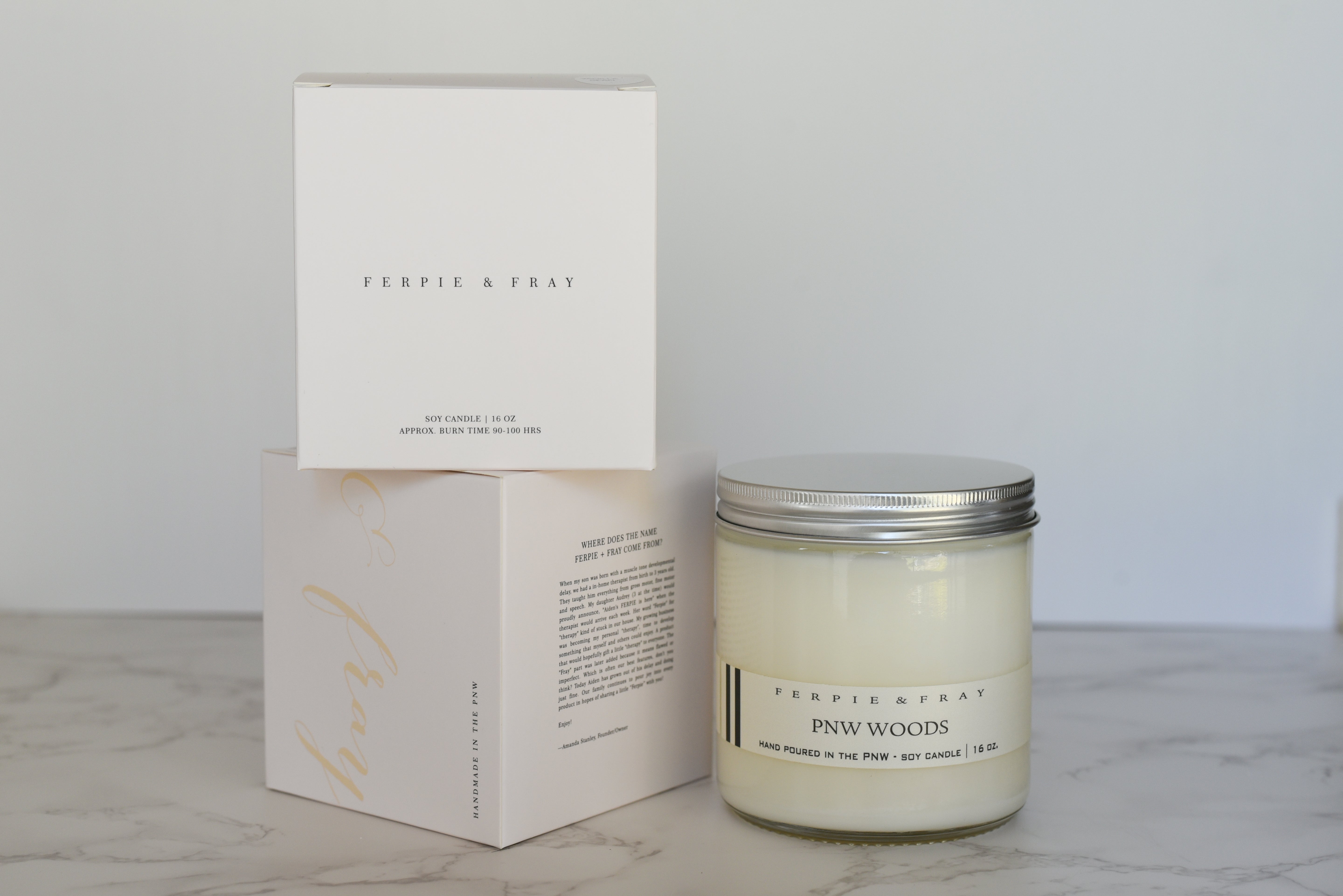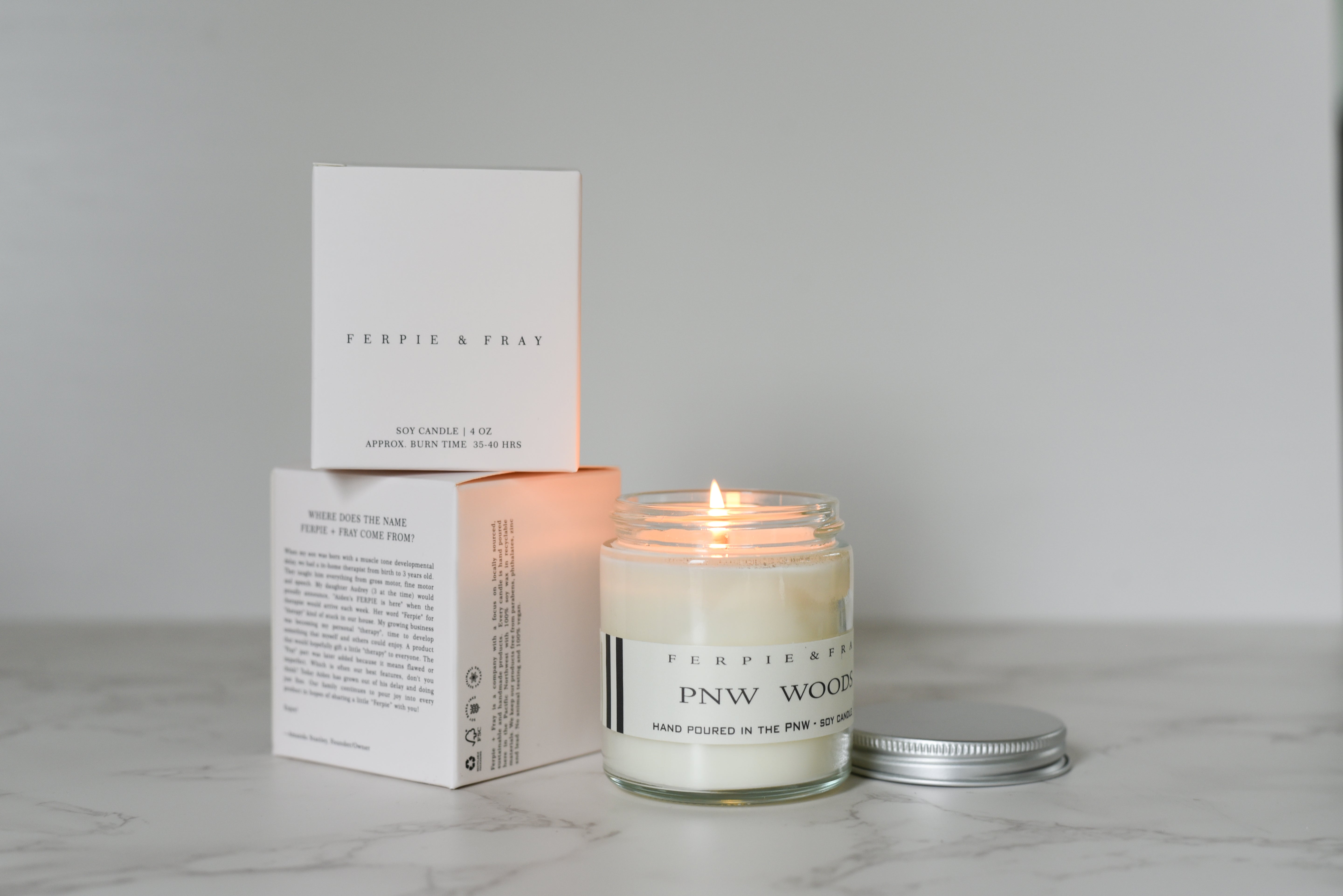 Our candles are 100% soy wax, with a cotton/soy braided wick for a slow, clean, and even burn. With careful detail, our fragrance oils are non-toxic for a unique blend that is paraben and phthalate free! Each candle is hand poured in our PNW based home studio.