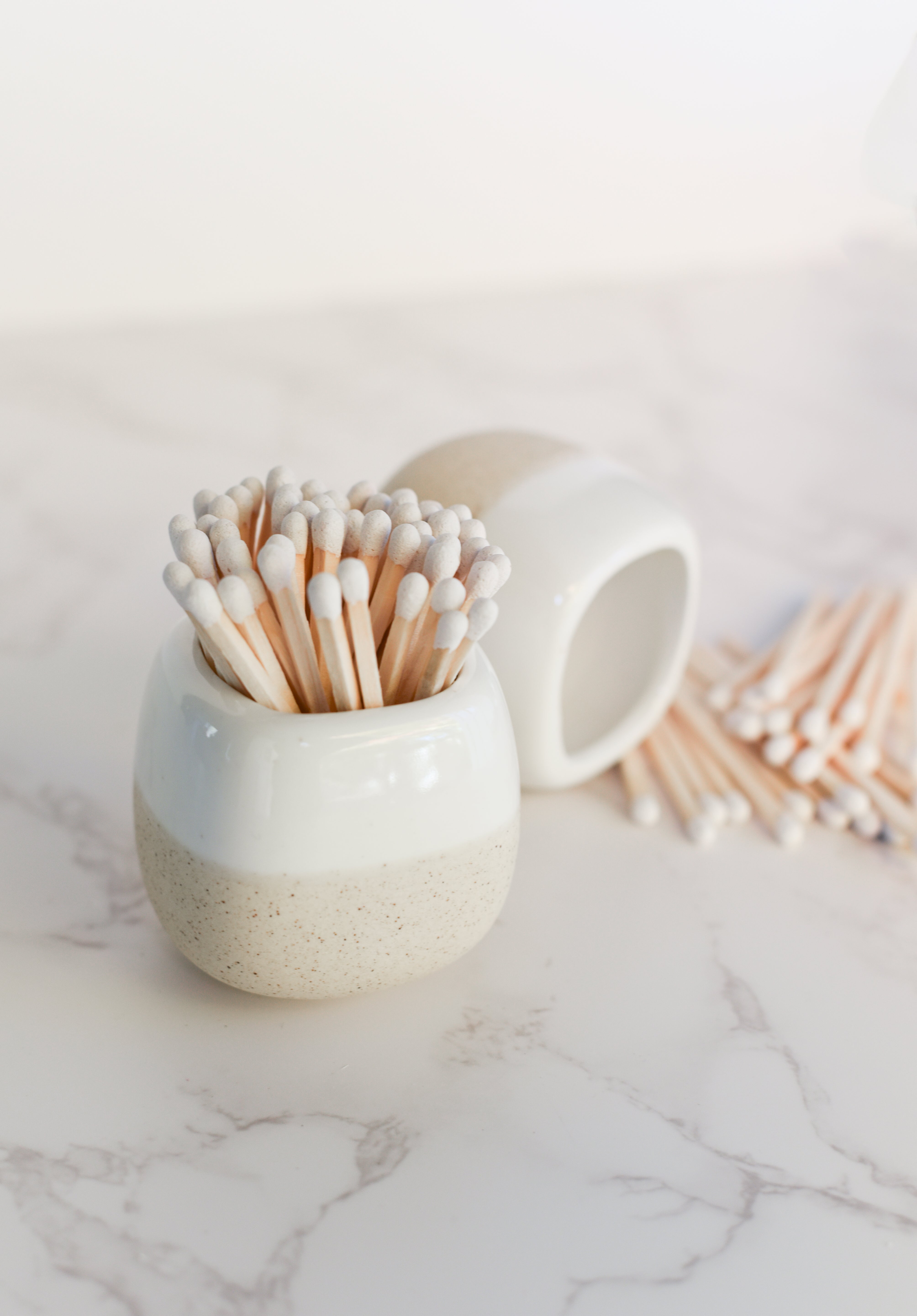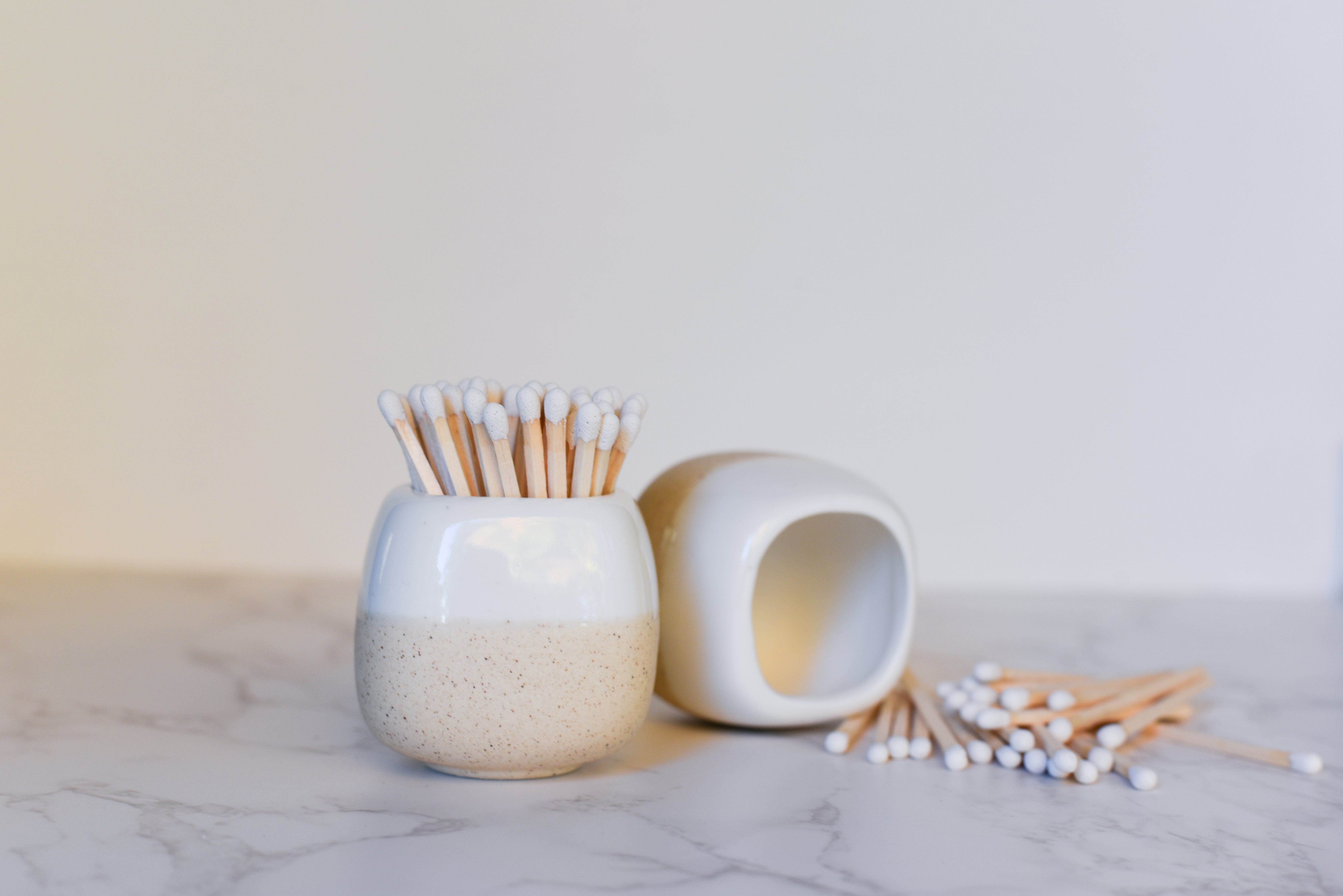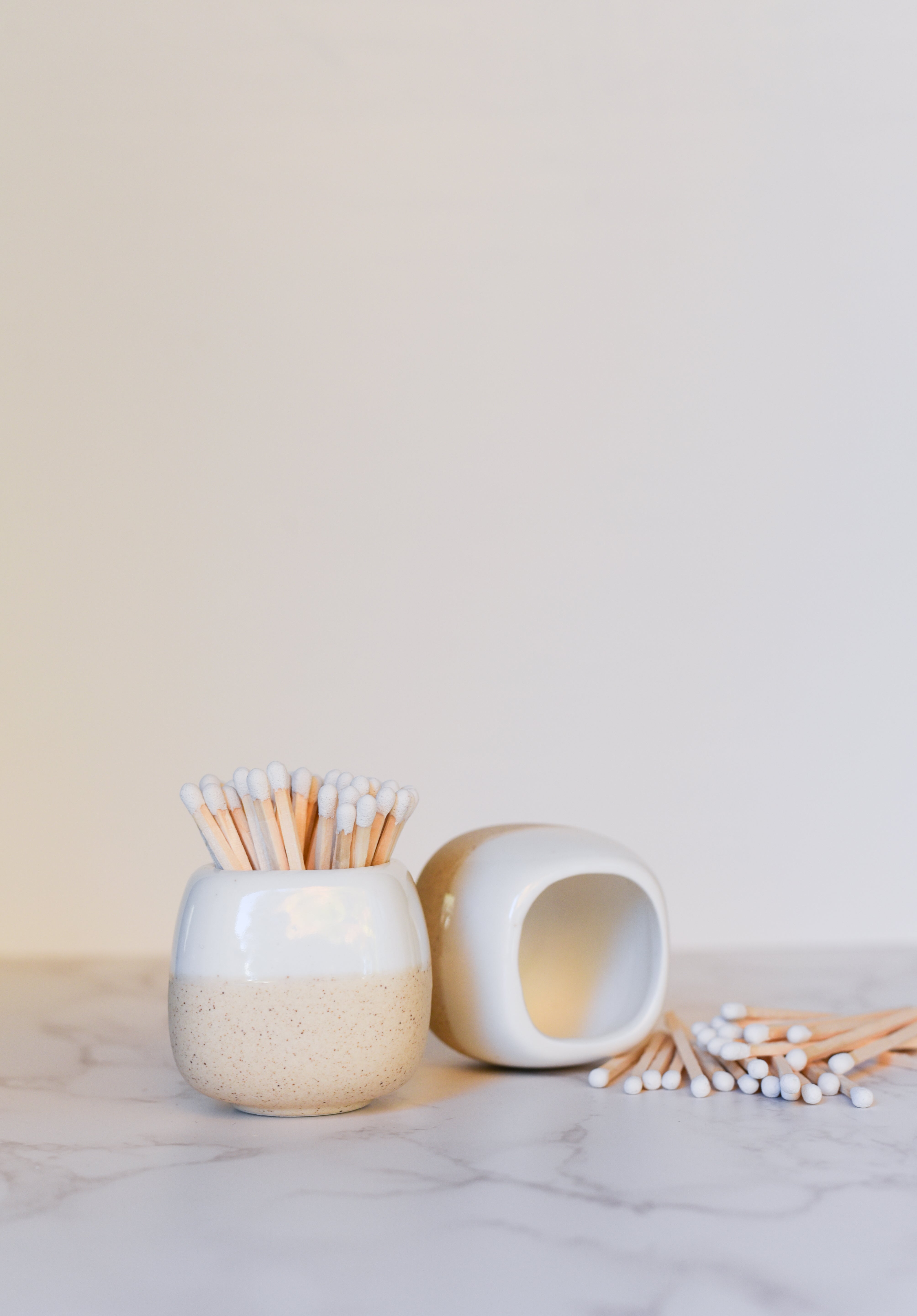 Beautiful white pottery match holder w/ white tip matches and strike pad. A great addition to any candle!